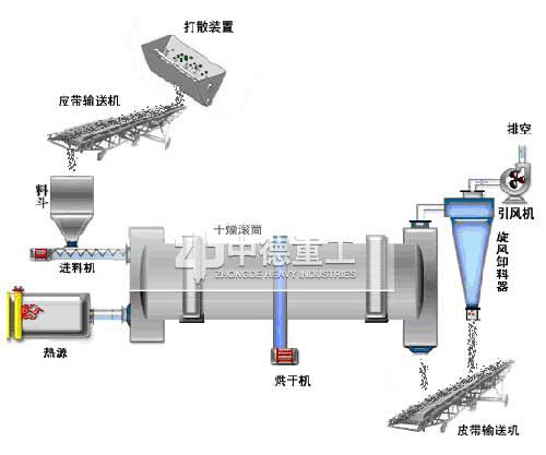 沙子由皮帶輸送機或斗式提升機送到料斗,然后經(jīng)料斗的加料機通過加料管道進入加料端,加料管道的斜度要大于物料的自然傾角,以便物料順利流入干燥器內(nèi),烘干機的滾筒是一個與水平線略成傾斜的旋轉(zhuǎn)圓筒,河沙等物料從較高一端加入,載熱體由低端進入,與物料成逆流接觸,也有載熱體和物料一起并流進入筒體的。隨著圓筒的轉(zhuǎn)動物料受重力作用運行到較底的一端,濕物料在筒體內(nèi)向前移動過程中,直接或間接得到了載熱體的給熱,使?jié)裎锪系靡院娓?,然后在出料端?jīng)皮帶輸送機送出。在轉(zhuǎn)筒內(nèi)壁上還裝有揚料板,主要是在轉(zhuǎn)筒滾動中將物料抄起再撒下,由此使?jié)窳喜灰渍辰Y(jié),充分與氣流接觸,得到效率高烘干。