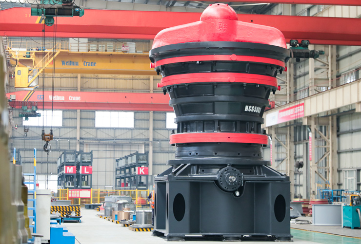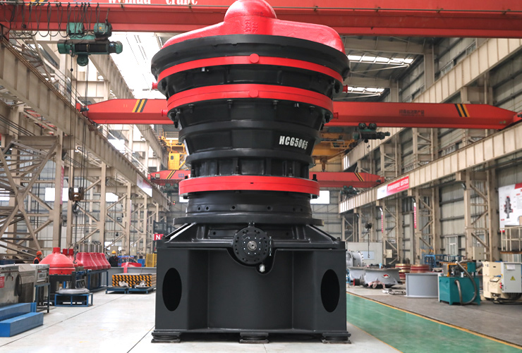 旋回式破碎機(jī)主要由橫梁部、上中下機(jī)架部、動錐部、偏心套部、傳動部和液壓缸部等組成。在設(shè)備工作時,由電動機(jī)帶動水平軸旋轉(zhuǎn),水平軸通過齒輪帶動偏心套旋轉(zhuǎn),再由偏心套帶動動錐部做圓周擺動,從而實現(xiàn)連續(xù)的擠壓破碎石塊??赏ㄟ^調(diào)節(jié)動錐底部的液壓缸改變排礦口的大小,方便調(diào)整產(chǎn)品粒度;同時液壓缸也提供過鐵保護(hù)功能,當(dāng)有不能破碎的物體進(jìn)入破碎腔時,液壓缸能自動使動錐下落釋放物體,保護(hù)破碎腔。